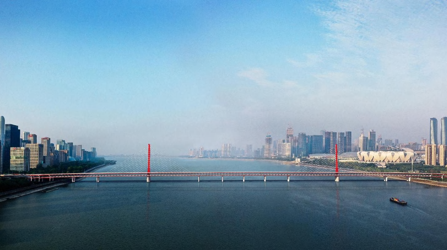 钱江三桥改建提升工程土建施工建设地点位于浙江省杭州市。钱江三桥主桥全长1280m,为单塔单索面双层钢桁梁斜拉桥,结构体系采用塔梁固结,全桥两联,全桥桥式立面布置为2×(72+80+168+168+80+72)=1280m。塔高78m,每塔有9对斜拉索。钢桁梁钢材用量约46167吨;钢索塔钢材用量约为1881吨。