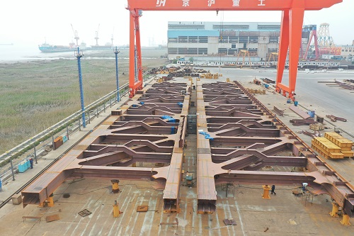 巢马城际铁路马鞍山长江公铁大桥作为巢马城际铁路的控制性工程,位于马鞍山长江大桥(公路桥)上游约2.3公里处,桥梁全长达9.8公里。其中,主桥采用主跨(2×1120)米三塔钢桁梁斜拉结构,总长3248米,是世界首座双主跨超千米的三塔斜拉桥、世界跨度最大的三塔斜拉桥,以及世界最长的联钢桁梁斜拉桥。大桥上层设计为双向六车道城市快速公路,下层则为双线巢马城际铁路,另设有两线预留铁路。大桥的三座主塔,分别为北主塔(3号塔)、中主塔(4号塔)和南主塔(5号塔),其高度分别为308米、345.6米和306米,为大节段钢-混组合桥塔形式,用钢量16.3万吨,沪宁钢机承担约7.8万吨钢梁加制作任务。