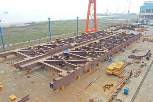 对于沪宁钢机来说,虽然参与过多座重大桥梁的钢结构制造,但参与公铁两用大桥钢桁梁的制造还是首次。与钢箱梁相比,钢桁梁体积庞大、结构复杂、构件繁多,对加工制造的精度要求也更为严苛。为此,沪宁钢机因地制宜采用“零件—板单元—杆件—桁片(或板块)—打砂涂装—大节段—总体预拼装—桥位连接”的生产方式,并充分发挥企业拥有一大批高精尖人才的技术优势,精雕细琢眼孔画线、焊接等细节,利用智能化手段强化标准化生产,实现精确对位控制,加工完成的钢桁梁一次探伤合格率高达99.7%。